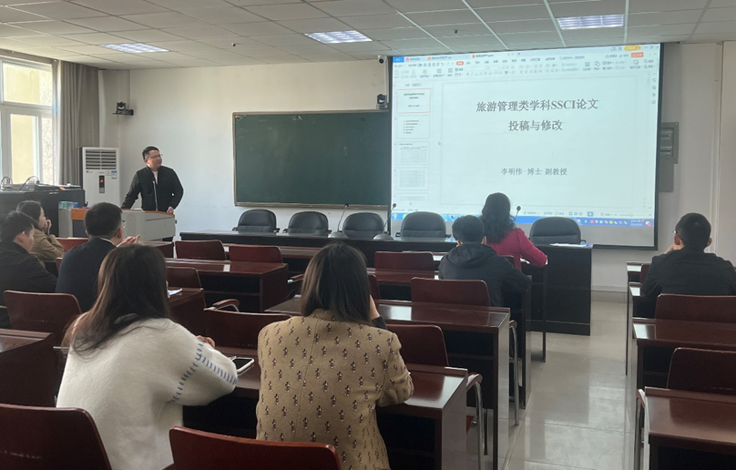 3月13日上午,欧美av 第七期“景明论坛”在经管楼401会议室成功举办。欧美av 李明伟博士作了题为“旅游管理类学科SSCI论文投稿与修改”的学术报告,欧美av 部分师生聆听了报告。