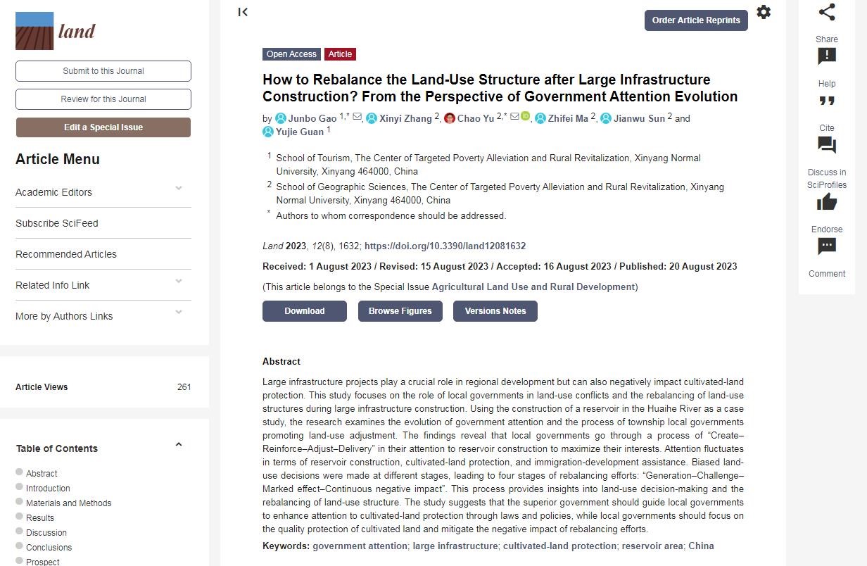 近日,欧美av 高军波教授团队在SSCI期刊《land》(2022年影响因子:3.905,JCR分区Q2)发表了题为《How to Rebalance the Land-Use Structure after Large Infrastructure Construction? From the Perspective of Government Attention Evolution》的论文。