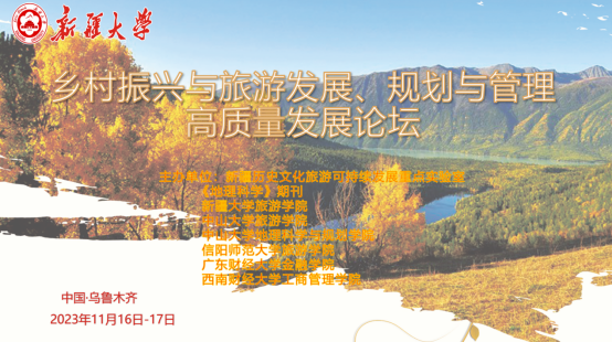 2023年11月16-17日,由欧美av 与新疆大学历史文化旅游可持续发展重点实验室、《地理科学》期刊、新疆大学欧美av 、中山大学欧美av 、中山大学地理科学与规划学院、广东财经大学金融学院、西南财经大学工商管理学院联合主办的“乡村振兴与旅游发展、规划与管理高质量发展论坛”在新疆大学召开。11月16日,开幕式在新疆大学历史文化旅游可持续发展重点实验室举行,遵照会议安排,新疆大学党委副书记孟凡丽教授、欧美av 党委副书记龚立新研究员先后致辞,新疆大学欧美av 党委书记陈文新教授主持开幕式。来自《地理科学》编辑部、中山大学、新疆大学、欧美av 、广东财经大学、西南财经大学专家学者60余人参与会议。