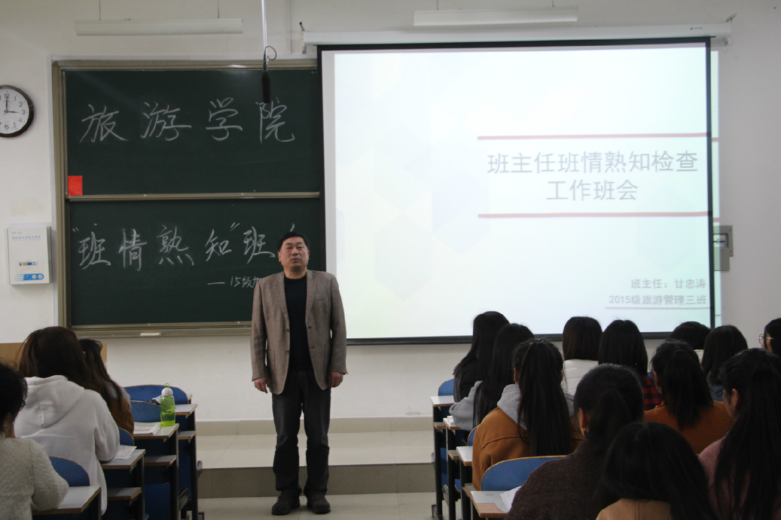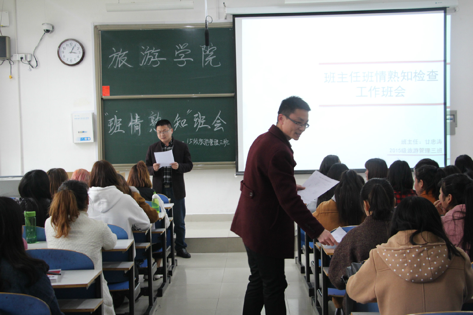 为响应学生处下发的《关于开展辅导员(班主任)班情熟知检查工作的通知》,3月17日下午,欧美av 2015级旅游管理三班班情熟知检查工作主题班会在经管楼202教室顺利召开。学生处副处长严彬,管理科科长黄树余及我院党委书记曹明贵,副书记张晓峰携全体辅导员参加班会。