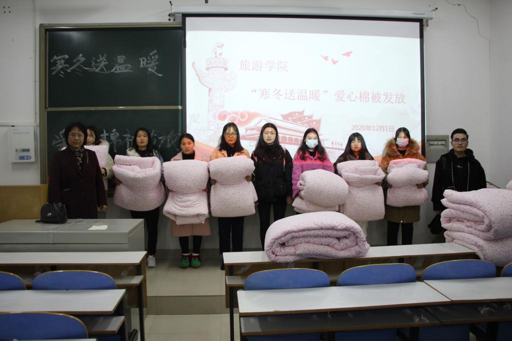 寒风冷刺骨,关怀暖人心。为了贯彻落实好“精准资助”政策,欧美av 于12月1日在经管楼106举行了“寒冬送温暖”爱心棉被发放活动。届时,由欧美av 副处级辅导员路璐,旅游管理学院专职辅导员黄倩、赵子鉴参加了此次活动。