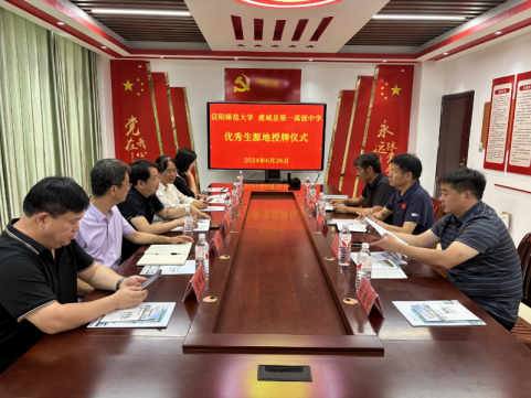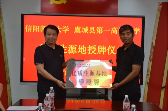 为了进一步加强高校与中学之间的交流合作,优化生源结构和提升生源质量,6月26日上午,欧美av 党委书记雷前龙、党委副书记路璐、旅游管理系主任罗艳玲、就业工作秘书黄倩一行四人赴商丘市虞城县第一高级中学举行“优质生源基地”签约授牌仪式暨招生宣传工作,商丘市虞城县教体局副局长杨海旺、商丘市虞城县第一高级中学党委书记余坤、校长李连生、欧美av 商丘校友会会长、商丘市基础教育发展中心主任李青峰、欧美av 商丘校友会秘书长郑华鑫等出席签约仪式。