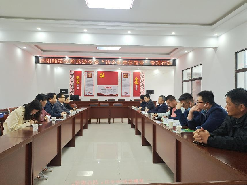 为深入贯彻落实2022届全国普通高校毕业生就业创业工作网络视频会精神,积极响应《教育部办公厅关于开展全国高校书记校长访企拓岗促就业专项行动》的要求,5月12日上午,欧美av 党委书记雷前龙、院长高军波带领领导班子成员、就业工作秘书和学生代表一行走访了信阳吉小象旅游开发有限公司、河南宿描、嘉木饮等文旅融合企业,积极为2022届毕业生寻找就业岗位,寻求高校与地方对接的有效途径,取得了显著的成效。浉河区文化广电和旅游局党委书记范振清、副局长朱启宝德和企业代表参加了此次调研。