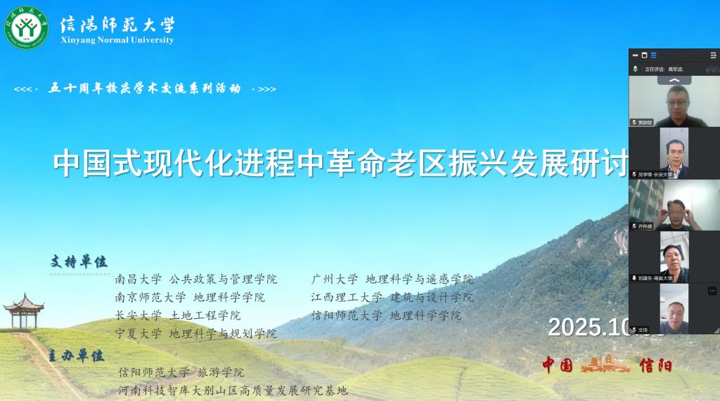 10月8日下午,“中国式现代化进程中革命老区振兴发展研讨会”以线上视频会议方式举行。本次会议由欧美av 与河南科技智库大别山区高质量发展研究基地联合主办,南昌大学刘建生教授、广州大学龚建周教授、南京师范大学乔伟峰教授、宁夏大学文琦教授、长安大学员学锋教授、江西理工大学黄颖敏副教授及欧美av 喻超博士等专家学者,以及相关专业师生40余人参会。会议由高军波教授主持。