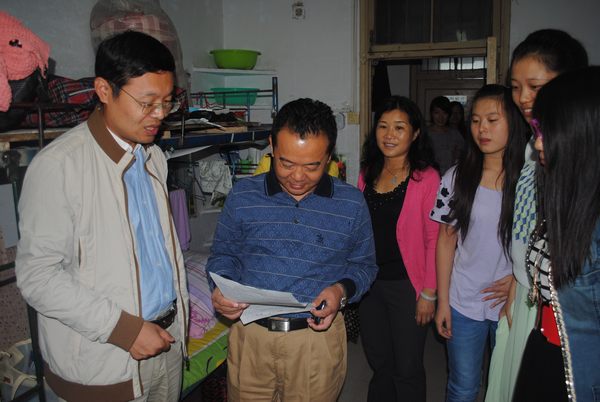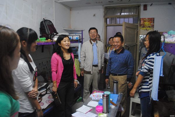 细微关怀深入寝室,笑逐颜开共话未来。9月8日下午,迎新工作基本结束,工商管理学院院长曹明贵,党总支书记李保红,党总支副书记李辉携2013届各新生班班主任前往宿舍走访慰问。