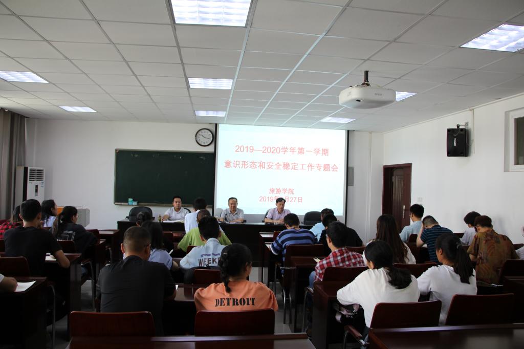 9月27日上午,欧美av 在经管楼401会议室召开意识形态和安全稳定专题工作会议。党委书记曹明贵、院长彭荣胜、党委副书记张晓峰出席会议。副处级辅导员路璐、团委书记张庆敏、思想政治教育与就业指导教研室主任甘忠涛、专职组织员闫会姝,班主任和主要学生干部记参加了会议。会议由张晓峰主持。