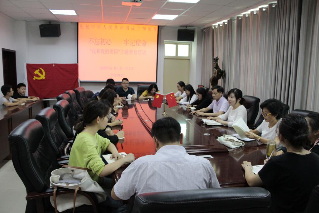 为庆祝中华人民共和国成立70周年,响应学院党委关于“不忘初心、牢记使命”主题教育的要求,进一步深化“我和我的祖国”主题教育活动,9月27日,欧美av 教工第一党支部和部分学生代表在经管楼403开展“我和我的祖国”主题党日活动。院长彭荣胜作为党委委员联系支部成员,以普通党员身份参加会议,会议由教工第一党支部书记谌静主持。