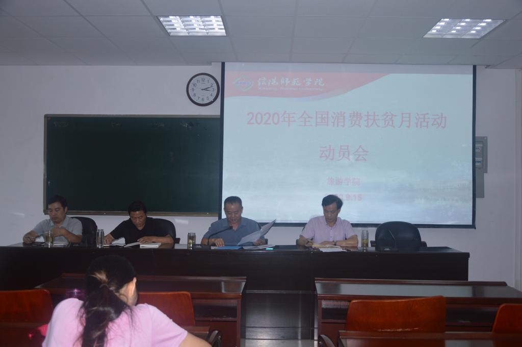 会上,曹明贵传达了学校消费扶贫月工作会议精神,并宣读了《信阳师范学院2020年全国消费扶贫月活动实施方案》。