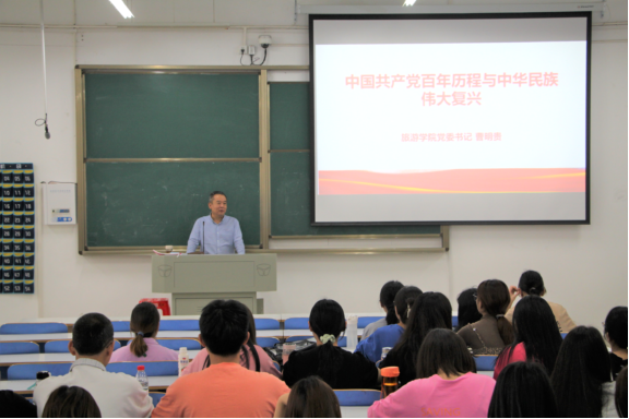 为深入开展党史学习教育,5月13日, 欧美av 党委书记曹明贵在社科楼215以《中国共产党的百年历程与中华民族伟大复兴》为题开展专题党课,2019级旅游管理3班和酒店管理班全体学生参于此次会议。
