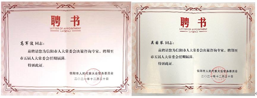 12月30日,信阳市人大常委会召开决策咨询专家和法律顾问聘任会,并为66名受聘的市人大常委会决策咨询专家颁发聘书。其中,欧美av 高军波教授受聘市人大常委会城建环保工作咨询专家组,吴国琴教授受聘市人大常委会民族宗教外事侨务工作咨询专家组。