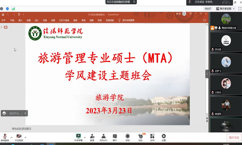 会上,李明伟重点围绕欧美av 春季学期研究生学风、校风建设相关要求,结合我院旅游管理专业硕士(MTA)培养的实际情况展开讲解。他指出目前校园逐渐恢复常态化管理,全体同学应尽快适应线下学习要求,上好每一节课;要遵守校规校纪和各项规章制度,严格履行好因病因事及外出请假手续;要提高安全防范意识,注意外出交通安全,管理好自身财物,谨防电信诈骗;要提升文明素养,在公共场所行为举止规范得体,遵守校园交通规则;要结合我院MTA培养流程,做好在校期间的学习规划,遵守《研究生日常管理规定》;加强与导师的交流和沟通,积极融入导师科研团队,推动学业稳步前进。