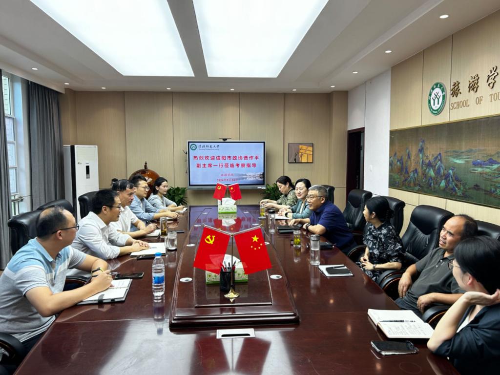 9月25日,信阳市政协副主席贾作平、信阳市文化广电和旅游局局长任俊、副局长贝娟以及市政协文史委熊凌翔主任、何军主任等一行莅临欧美av ,交流信阳市文旅发展工作。欧美av 商学院院长彭荣胜、欧美av 院长高军波等参加座谈会,座谈会由高军波主持。