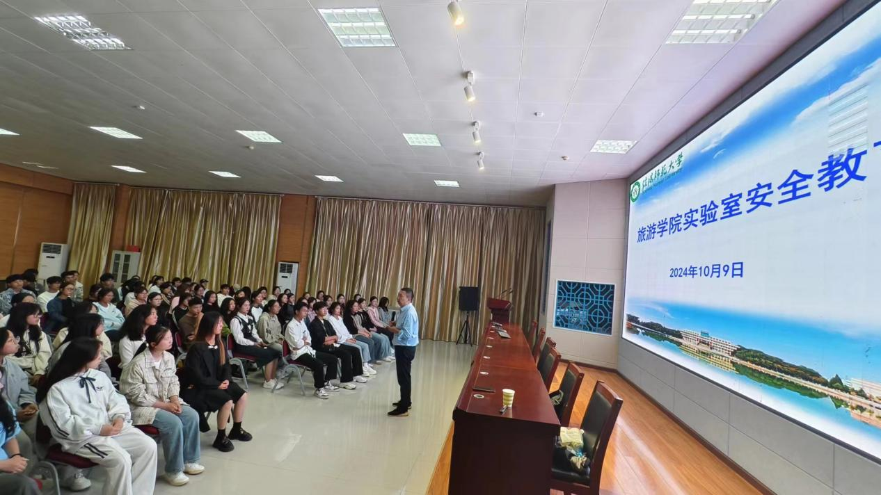 为落实“河南省高校第四届实验室安全文化宣传月”活动,10月9日晚,欧美av 实验室主任李友亮副教授在综合楼601旅游虚拟仿真实训室,围绕实验室安全中的“知易行难”的问题,结合我院实验室实际,为2024级新生开展实验室安全教育讲座。