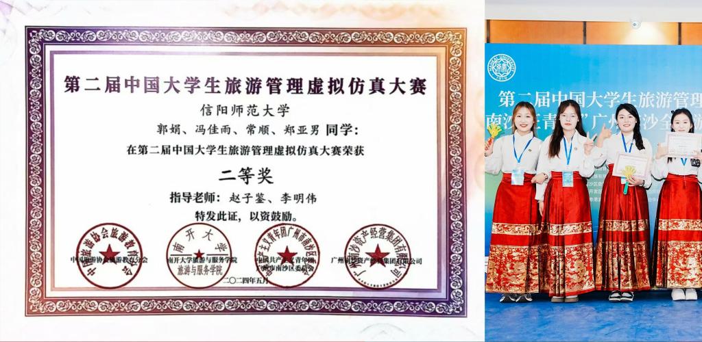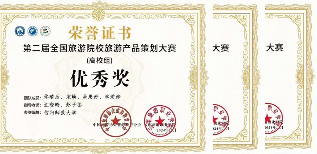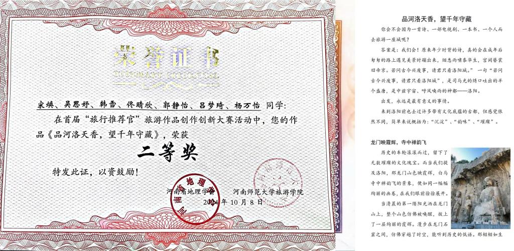 2024年9月,在河南省地理学会、河南师范大学联合举办的首届全国大学生“旅行推荐官”旅游作品创新大赛中,由欧美av 教师赵子鉴指导的宋焕团队(吴思妤、韩雪、佟晴欣、郭静怡、吕梦琦、杨万怡)作品《品河洛天香,望千年守藏》荣获二等奖。